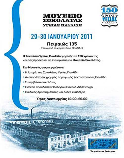 Η Σοκολάτα Υγείας Παυλίδη γιορτάζει τα 150 χρόνια της και σας προσκαλεί σε ένα πρωτότυπο Μουσείο Σοκολάτας. Η παλαιότερη ελληνική σοκολάτα που έχει αγαπηθεί από πλήθος γενεών και έχει συνδεθεί με τις πιο ζεστές μας αναμνήσεις, σας δίνει την δυνατότητα να ζήσετε μια μοναδική σοκολατένια εμπειρία, σε ένα Μουσείο διαφορετικό από όλα τα άλλα – στο Μουσείο Σοκολάτας Υγείας Παυλίδη – υπό την αιγίδα του Δήμου Αθηναίων.